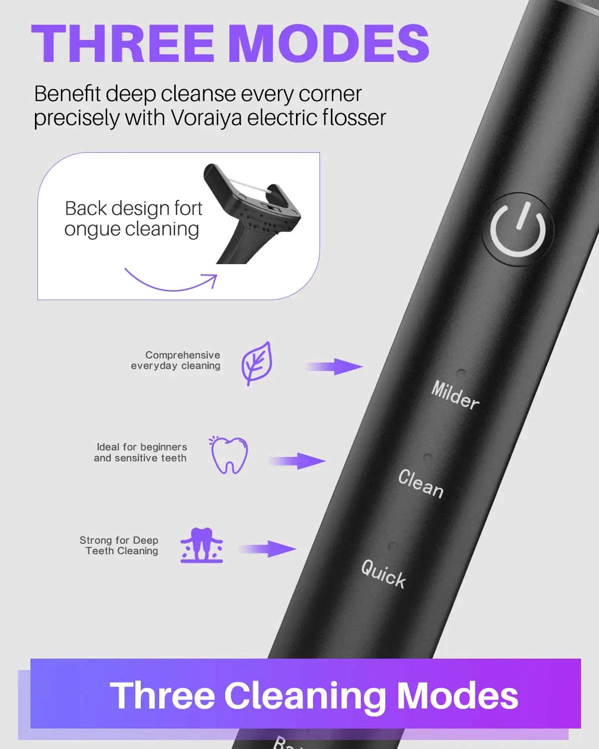 - Select Mode: Press the power button to turn it on, and click again tochoose Milder, Clean, or Quick mode.